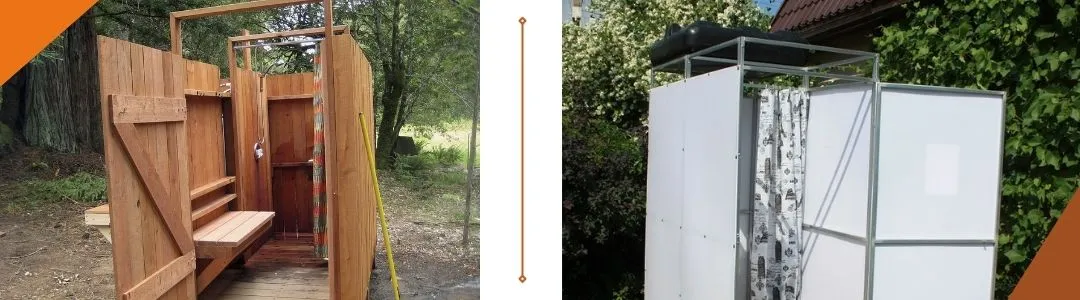 При строительстве летнего душа рекомендуем обращать особое внимание на его местоположение. По возможности лучше выбирать территорию на удалении 3-4 м от основных построек, чтобы в ходе эксплуатации не допускать намокания их фундамента и стен. Кроме того, стоит заранее определиться с размером постройки. Минимальные комфортные в использовании размеры кабинки 1 × 1 м. В зависимости от выделенного бюджета и интенсивности использования душа строение может быть временным или капитальным. Чтобы возвести долговечную, эстетически привлекательную конструкцию в минимальные сроки, можно использовать деревянный брус, профнастил, поликарбонат, ДПК. Каркас может быть деревянным или металлическим.